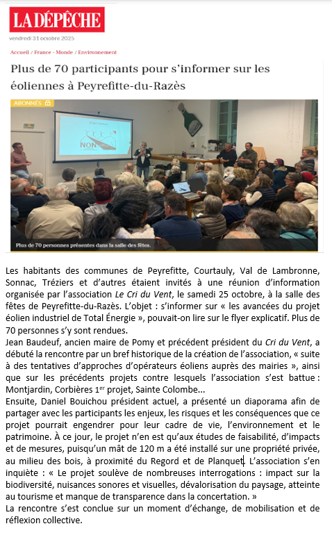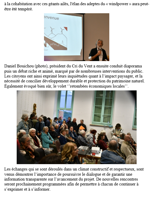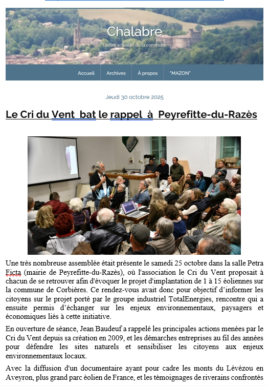 Voici l’un des slogans que l’on pouvait lire devant la mairie en ce matin du samedi 19 septembre. Le président de l’association Le Cri du vent, Jean Louis Patisson, avait été informé quelques jours auparavant par M. Lefèvre, maire de Sonnac, du dépôt de son projet de création d’une zone de développement éolien (ZDE) sur sa commune et celle de Corbières.